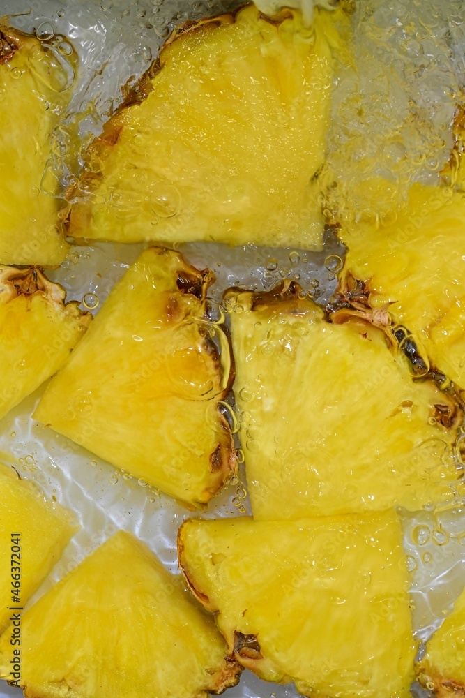 Close up view of the yellow pineapple slices in lemonade background. Texture of cooling sweet summer's drink with macro bubbles on the white background. Flat design. Vertical image