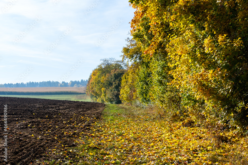 Am Rand eines Feldes steht eine Hecke mit herbstlich gefärbten Laub. Diese bietet Schutz gegen Erosion und Lebensraum für Pflanzen und Tiere