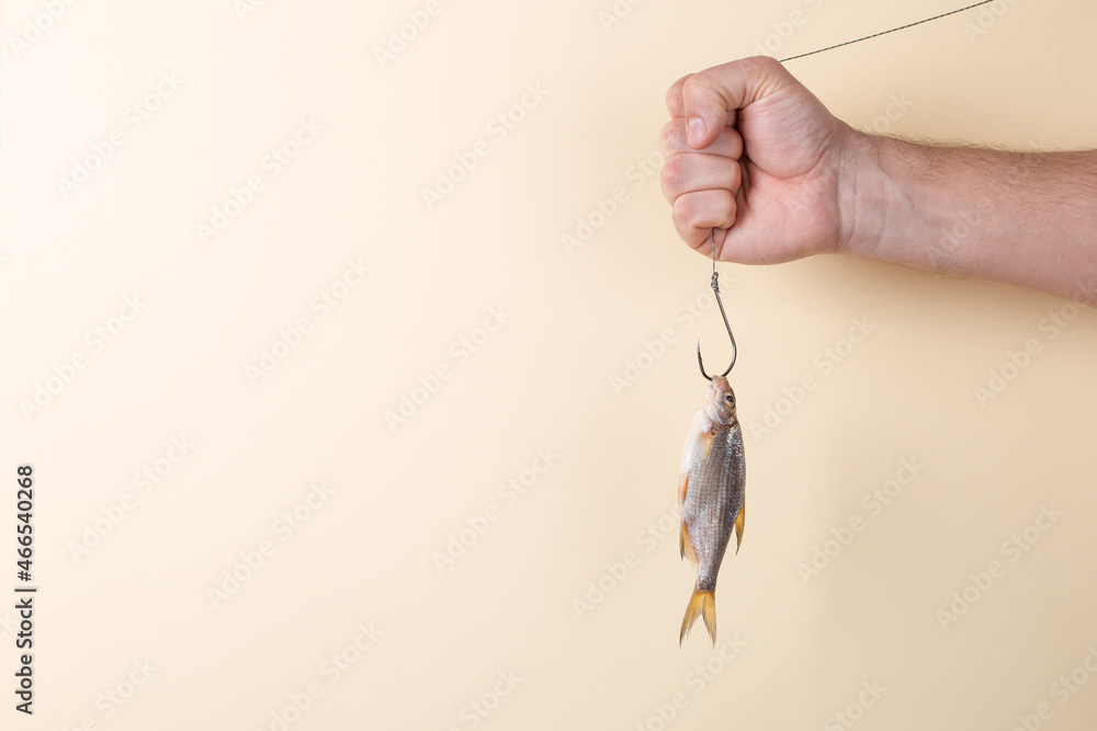 A man's hand holds the fish on a hook, on a yellow background. Concept, template.