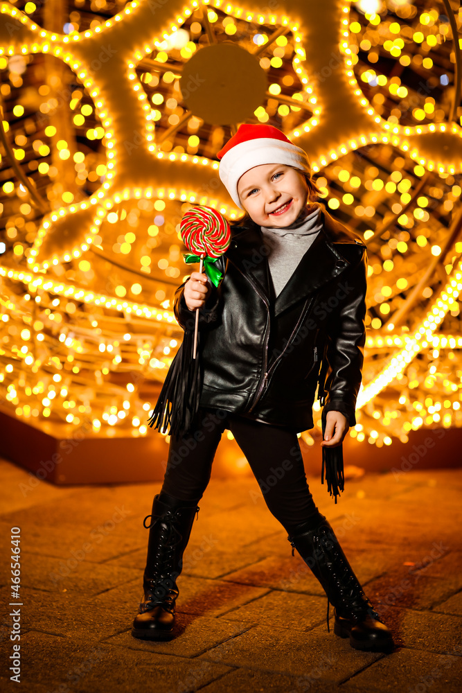 a beautiful, cheerful little girl in a Santa Claus hat,standing near the lights,with a lollipop in her hand on a festive evening, on the street