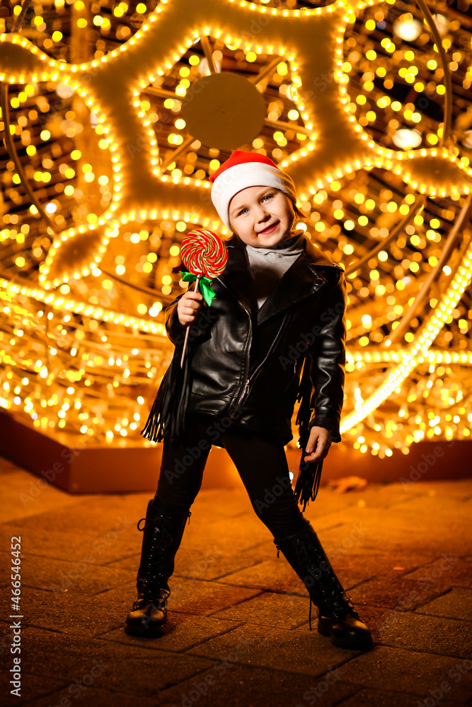 a beautiful, cheerful little girl in a Santa Claus hat,standing near the lights,with a lollipop in her hand on a festive evening, on the street