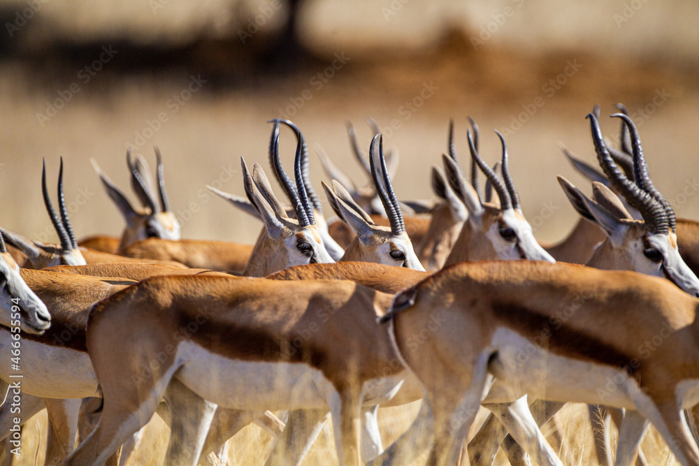 Springbuck congregating around a waterhole in the Kalahari desert, South Africa