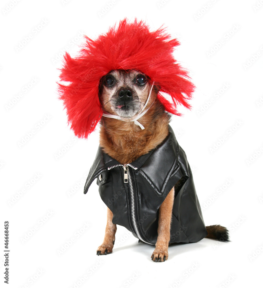 a chihuahua dressed up in a wig