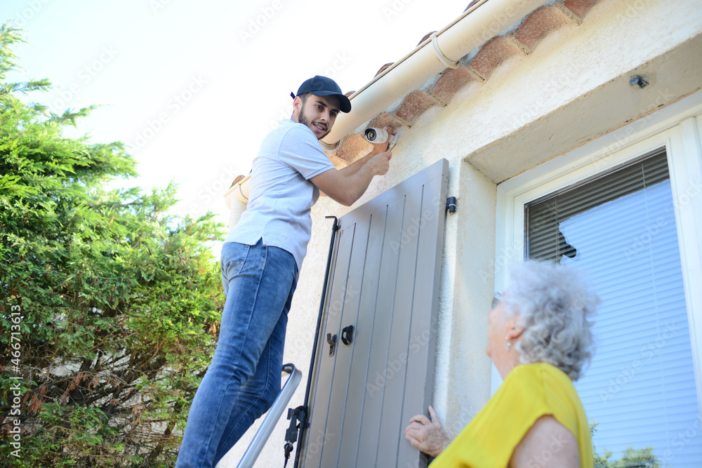 handsome young man installing house security anti burglary camera and siren alarm in a senior woman home