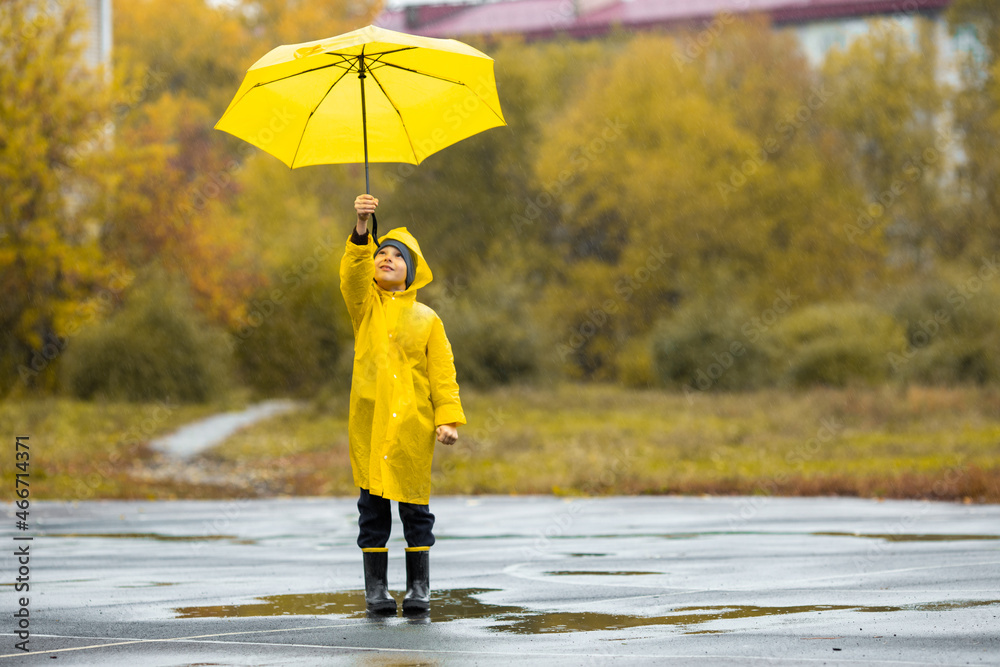 Boy in yellow waterproof cloak and black rubber boots with umbrella walk in a puddlein in park in the rain in autumn. Outdoor activity