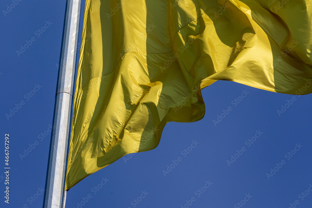 State blue and yellow flag of Ukraine in the park on a flagpole against the sky
