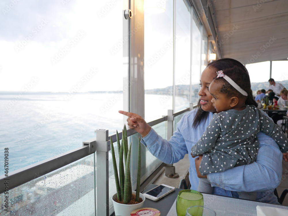 Black Woman and her Baby Girl Eating in French Restaurant Overlooking the Sea in Nice, South of France (Promenade des Anglais) - Mother and Daughter, Black Family on Vacation in Europe