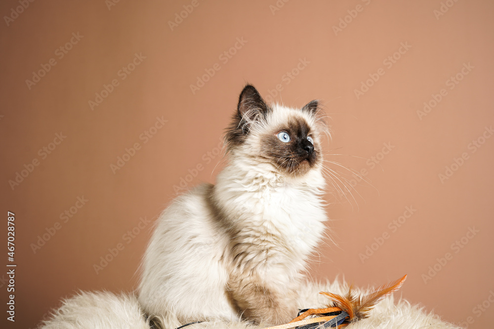 A small beige colored ragdoll baby kitten cat a on fluffy sheepskin rug on brown background