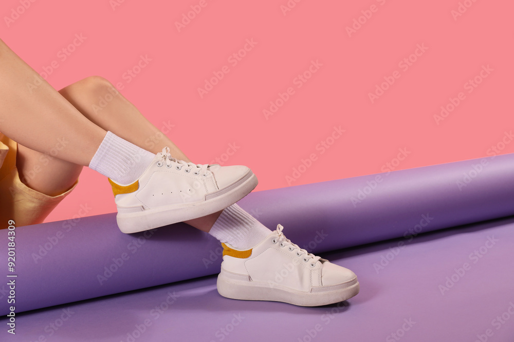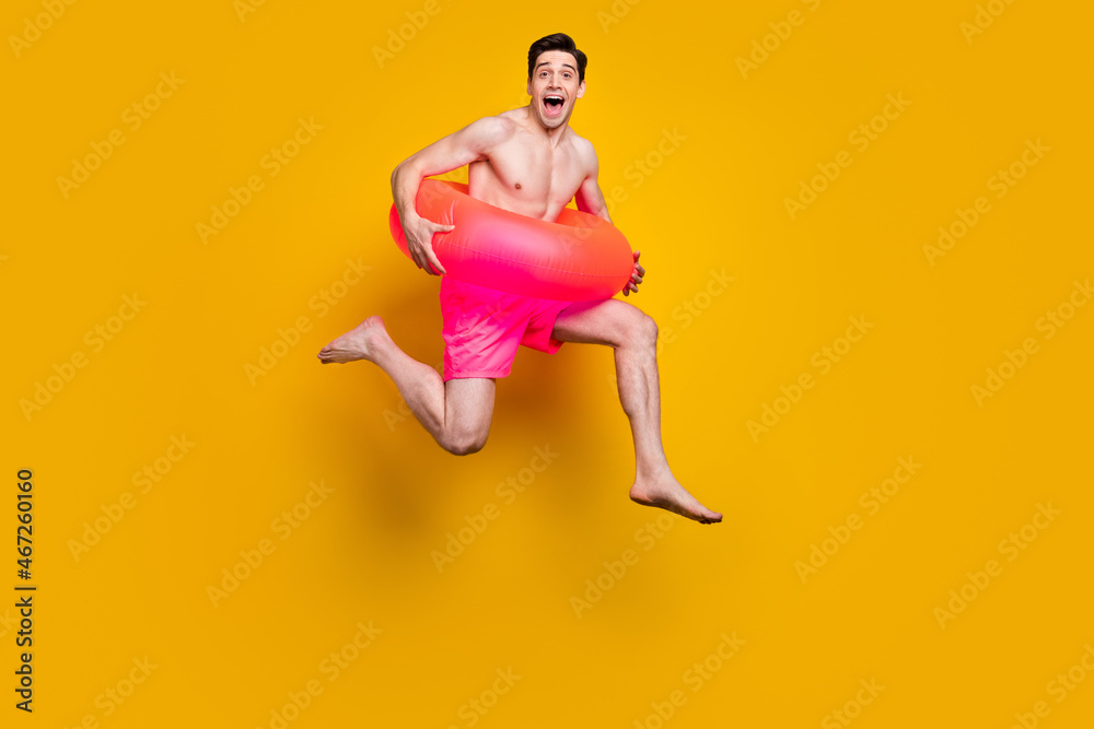 Full size profile side photo of young excited man happy positive smile jump ring isolated over yellow color background