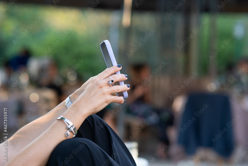 Female lands holding a smartphone while reading or texting.