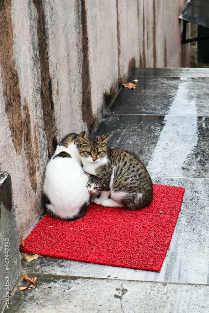 cat with the beautiful cute little kittens on the Istanbul street under the rain