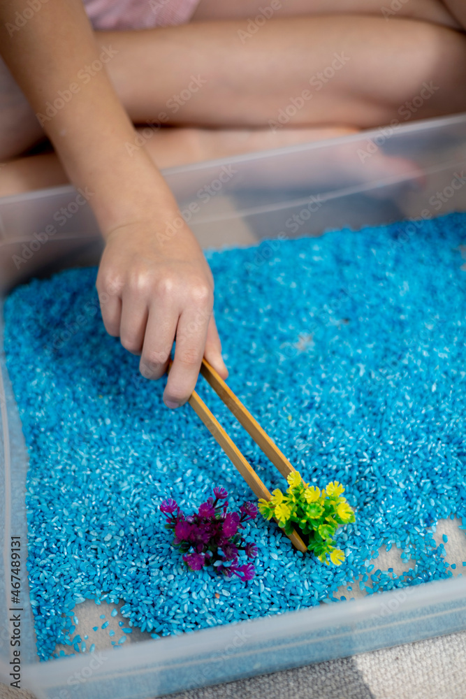 Touch drawer with rainbow rice inside. Children touch the texture. Montessori material concept for toddlers.