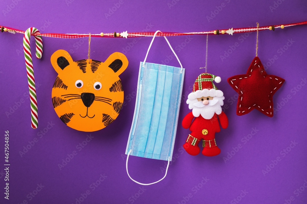 Symbol of 2022, Christmas tree toys and a medical mask hang on a decorative ribbon on a colored background, the concept of quarantine for the new year