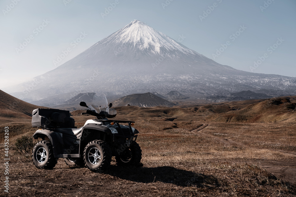 ATV Quad bike on volcano background. Klyuchevskaya Sopka, Kamchatka, off-road trip