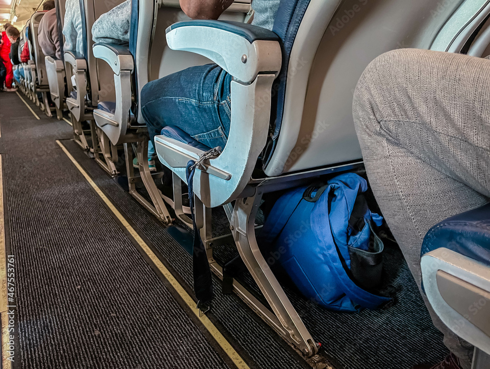 passenger seat, aircraft interior with passengers seated in the seats, and aisle in the background. Travel concept