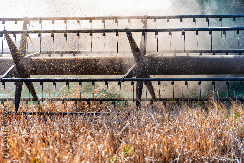 the reel of a agricultural combine harvester cuts wheat cereals in the dust, harvesting season