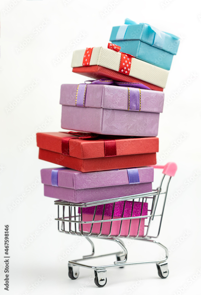 Colorful gift boxes in a shopping cart on white background. Annual sale shopping season concept