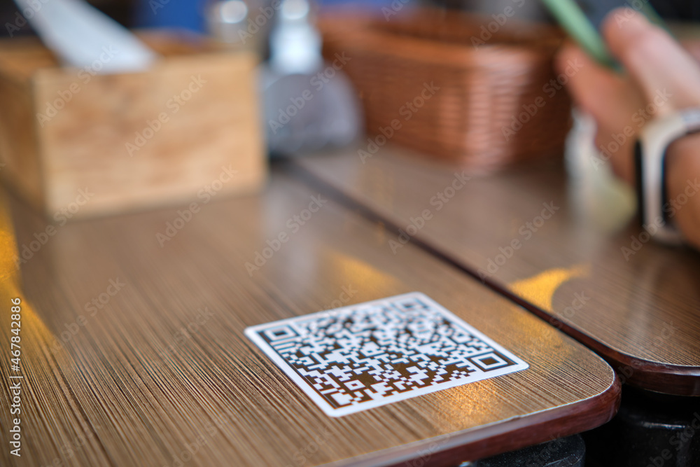 Closeup of guest hand ordering meal in restaurant while scanning qr code with mobile phone for online menu