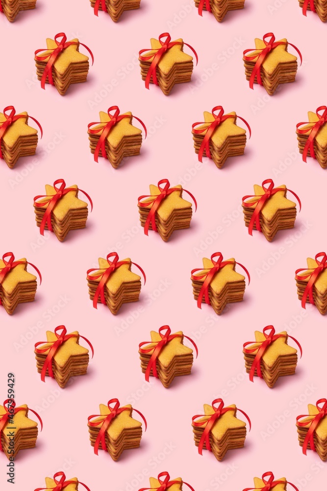 Christmas gingerbread cookies decoration on red background. New Year party pattern. Minimal style. Flat lay.