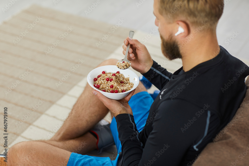 Athlete enjoying healthy meal rich in fiber, protein and vitamins. Fit young man sitting on floor in living room, relaxing after fitness workout, eating natural vegetarian granola, listening to music