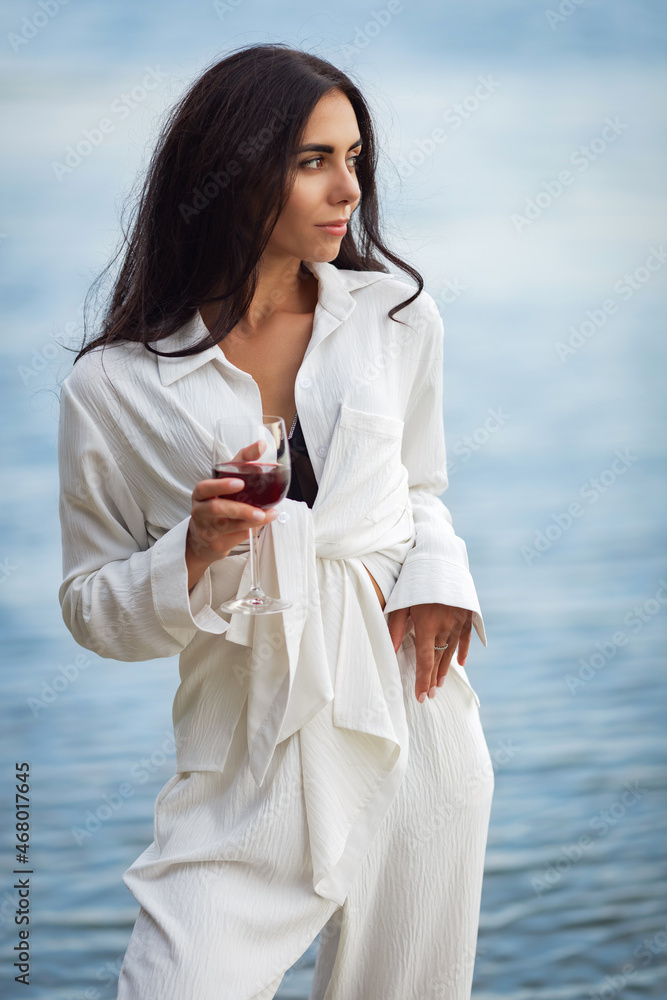 Sexy young brunette in a black bikini and white suit with a glass of wine posing on the beach. High quality photo