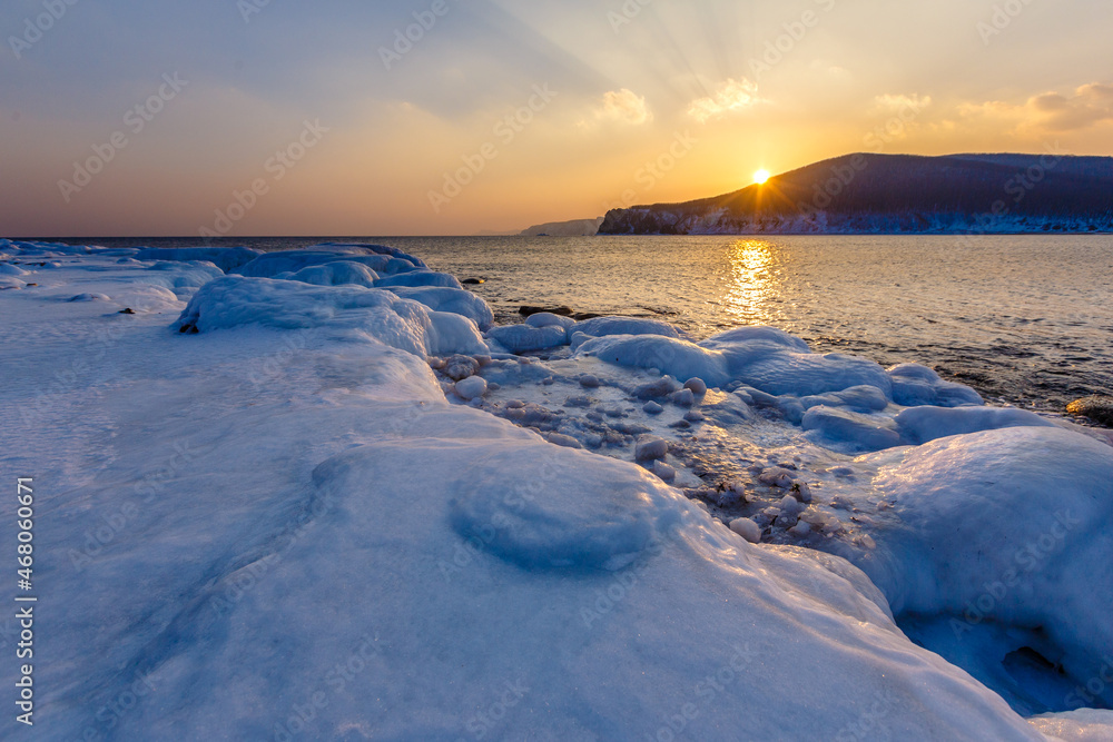 Colorful sunset on the snowy coast of the Sea of Japan. The Sonce goes over the snowy hills against the backdrop of the calm sea. Sikhote-Alin Biosphere Reserve in the Primorsky Territory.