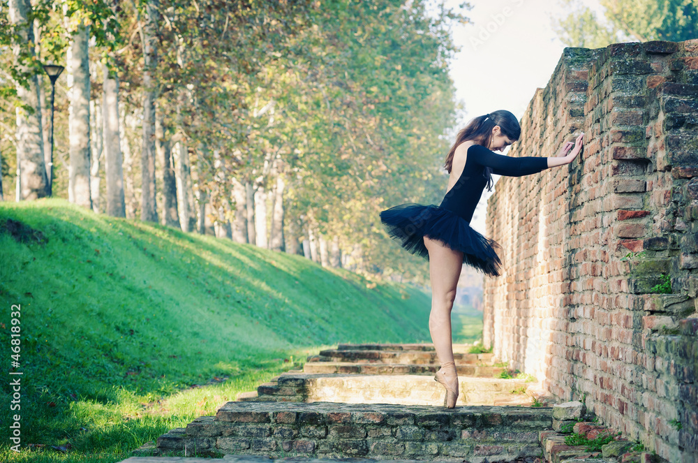 Young beautiful ballerina dancing outdoors in Ferrara.