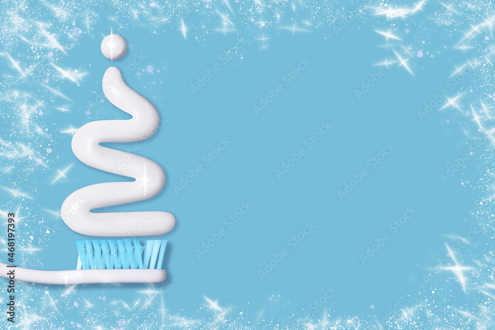 Merry Christmas and Happy New Year card for dentistry with toothbrush and fir tree made from toothpaste on blue background with copy space. Dental care concept.