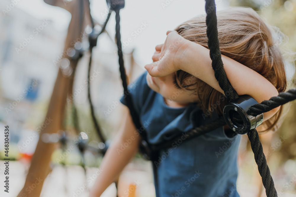 pretty little brunette boy in a blue T-shirt is climbing a rope web. child is engaged in outdoor sports. healthy active kid. lifestyle. space for text. High quality photo