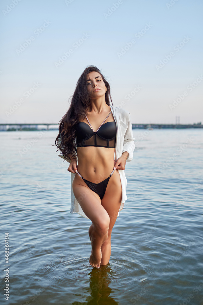 Sexy young brunette in a black bikini and white suit posing on the beach. High quality photo