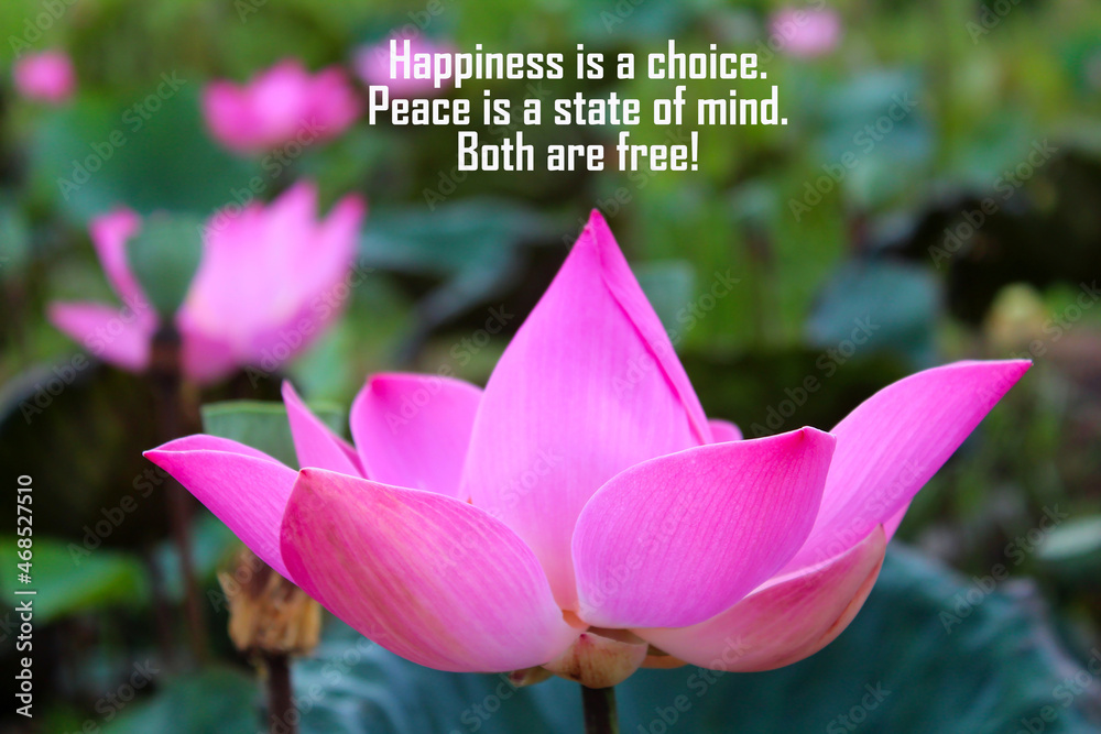 Inspirational quote - Happiness is a choice. Peace is a state of mind. Both are free. With red pink lotus flowers or Nelumbo nucifera blossom in the pond. Life freedom quote with nature concept.