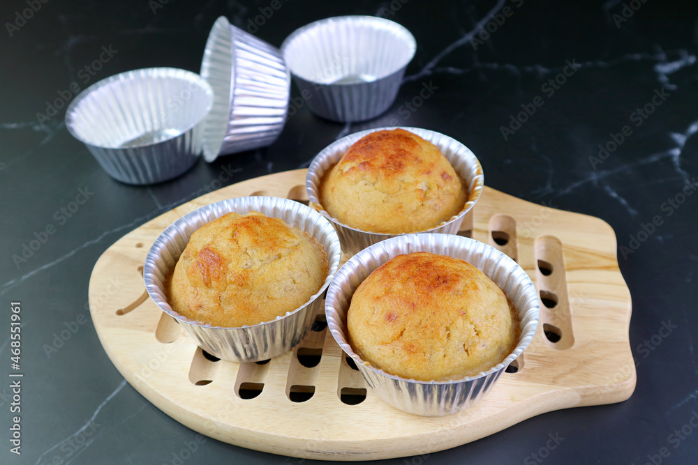 Delectable Banana Muffins in the Molds on a Wooden Breadboard with Empty Molds in the Backdrop