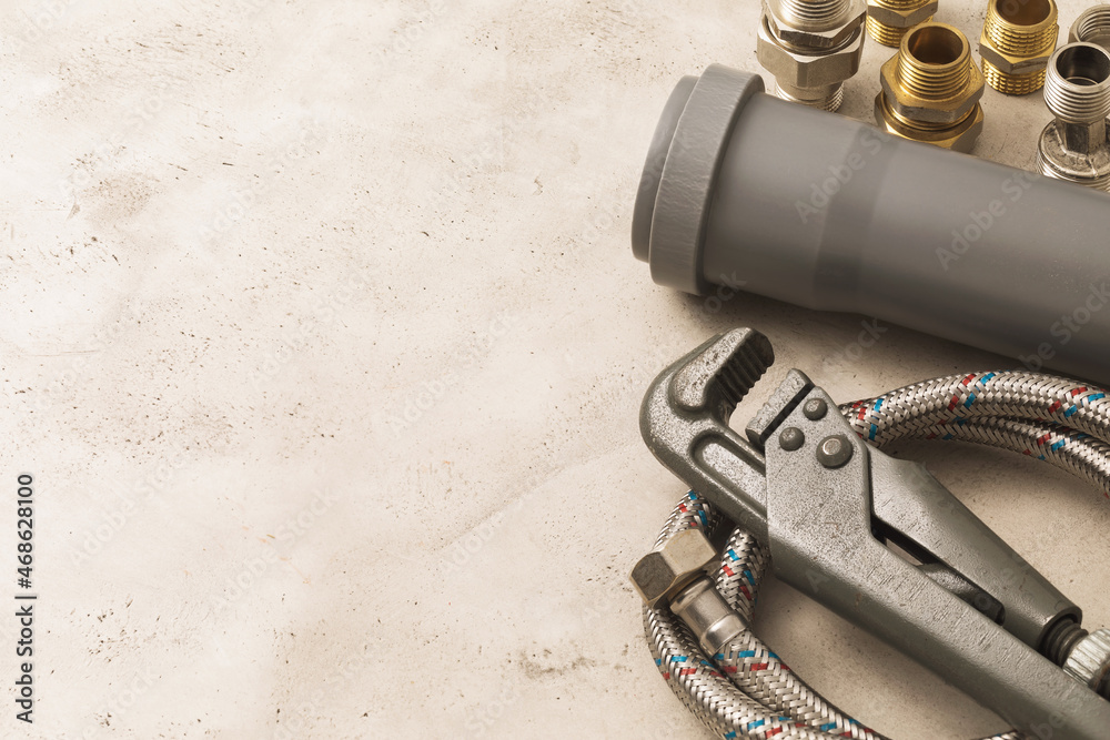 Various plumbing tools with copy space, gas adjustable wrench, pipe, adapters and flexible hoses