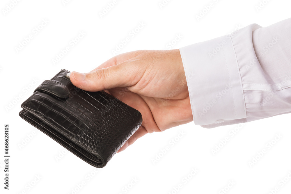 Man holds in his hand a leather wallet isolated on a white background, template for the designer