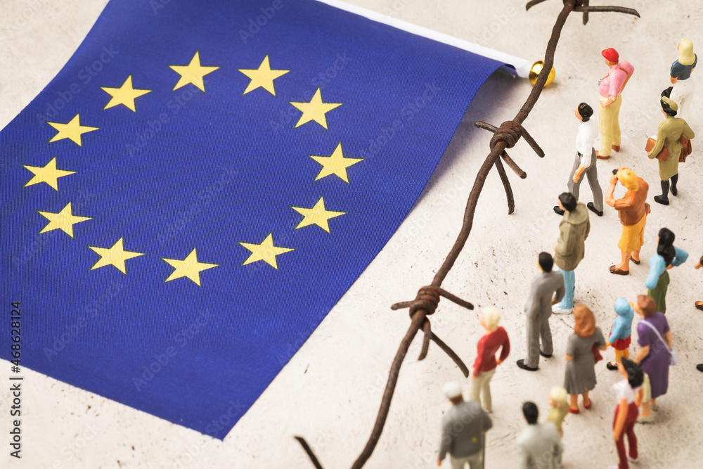 Plastic toy men, barbed wire and eu flag, migrants crossing the border concept