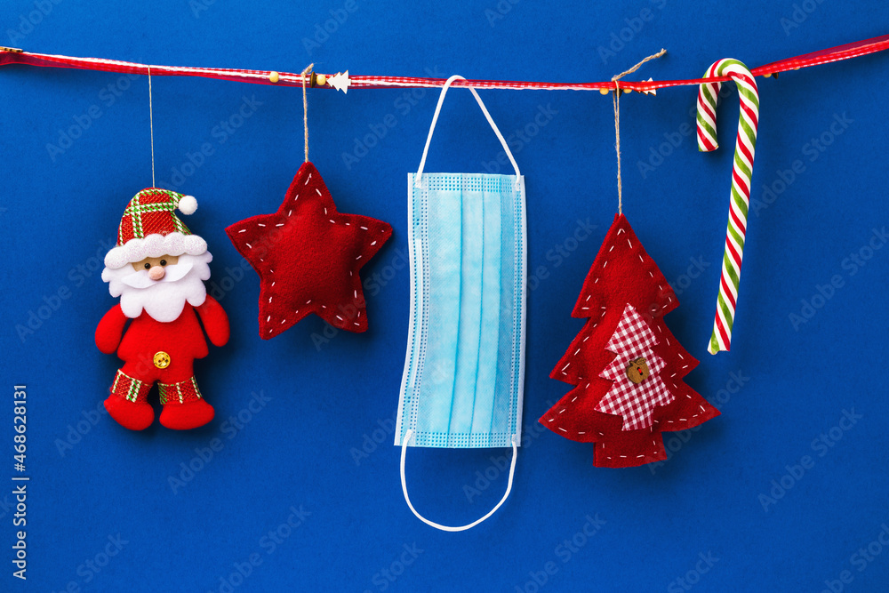 Christmas felt decorations and disposable medical mask hang on decorative ribbon on blue background, holiday quarantine concept
