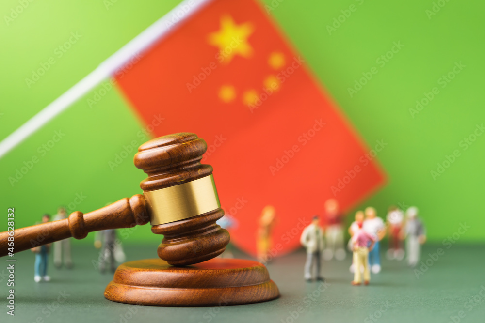Judge gavel against blurry flag background and toy plastic men, concept of litigation in China