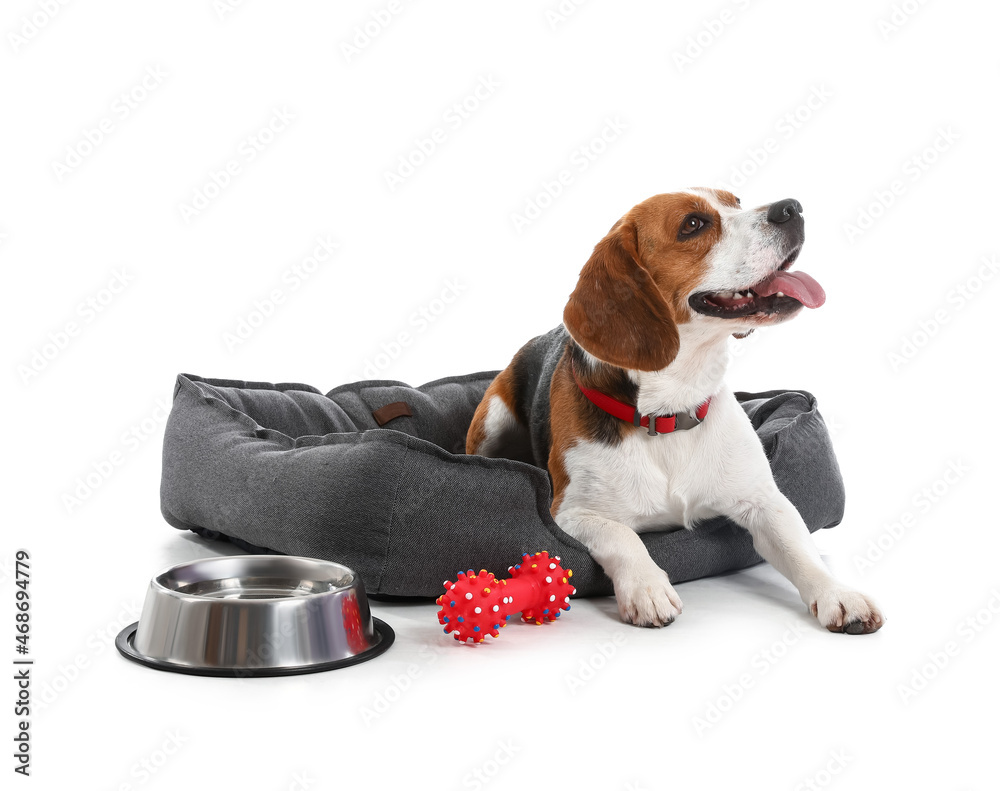 Cute Beagle dog with pet bed, bowl and toy on white background