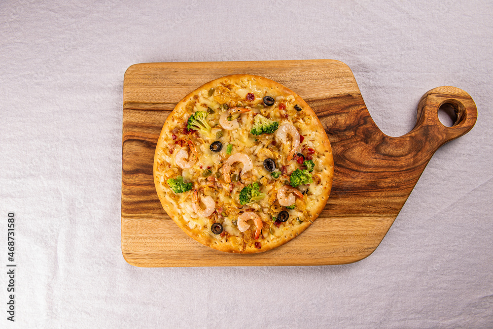 신선한 재료로 만든 토핑을 올린 맛있는 이탈리아 전통 피자