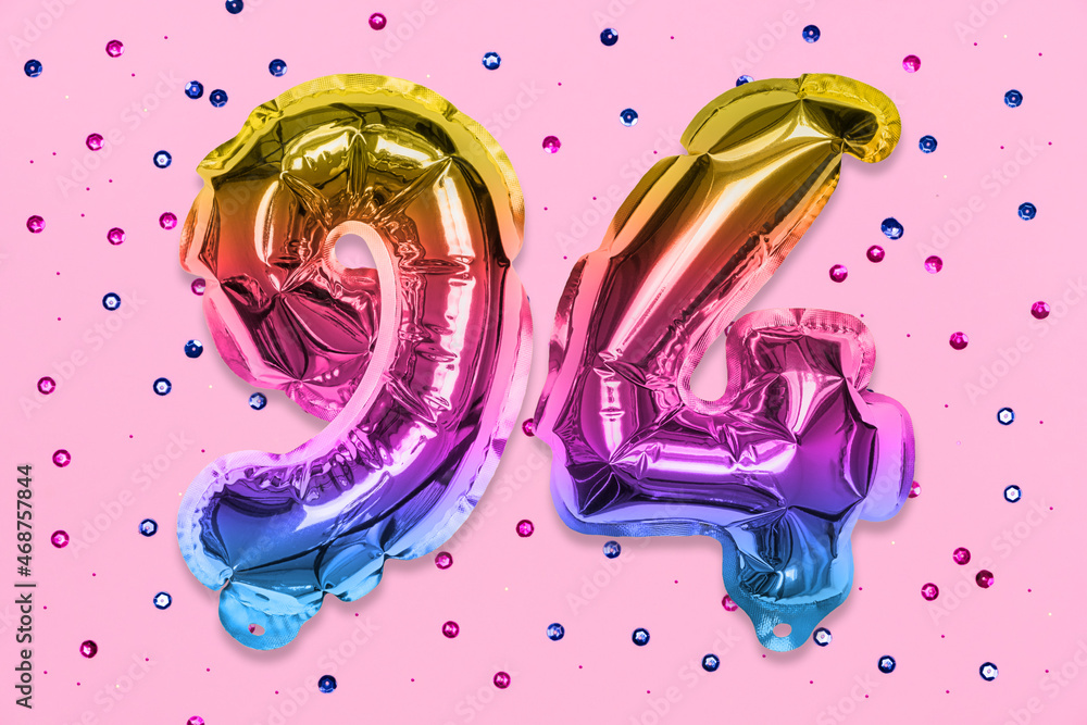 Rainbow foil balloon number, digit ninety four on a pink background with sequins. Birthday greeting card with inscription 94. Top view. Numerical digit. Celebration event, template.
