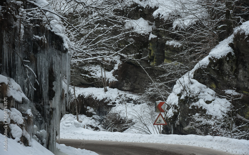 Large icicles hanging of a sharp cliff in Jiet Valley and gorges. Winter season, the snowed rocks are narrowing the valley. Carpathia, Romania.