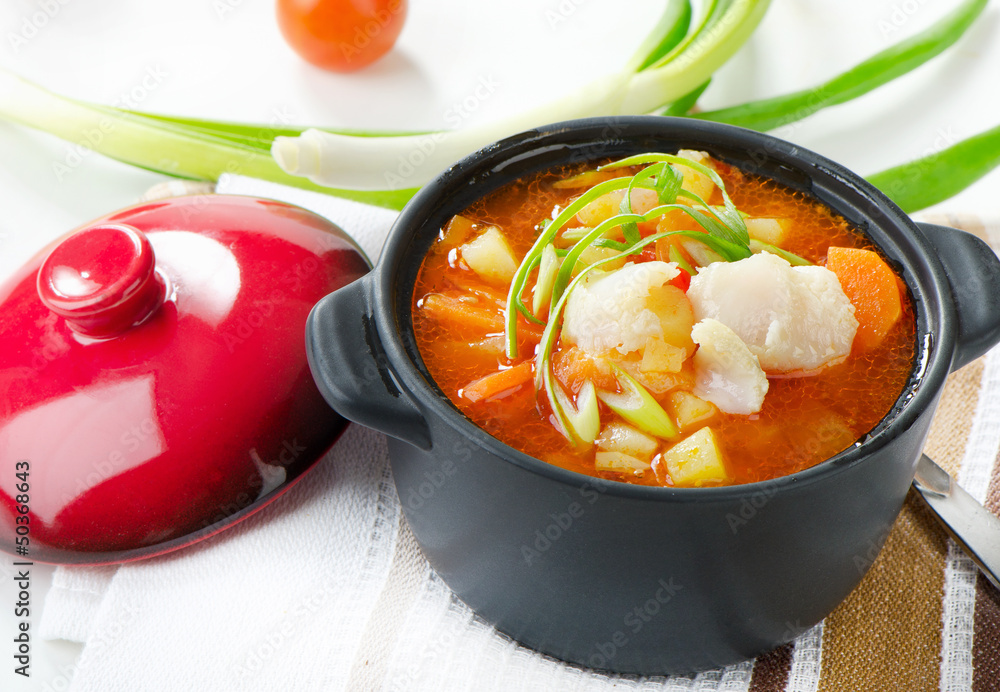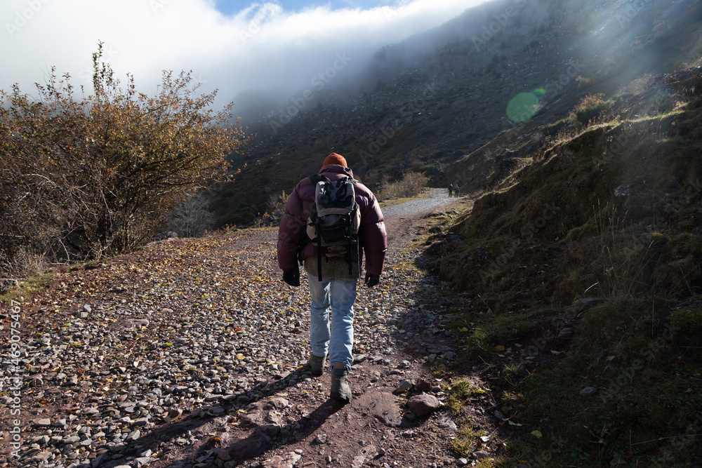 A mountaineer, senior adult man, in his 70s, wearing a down coat and backpack, walks down a dirt track towards the cloudy mountains, Pyrenees, Spain