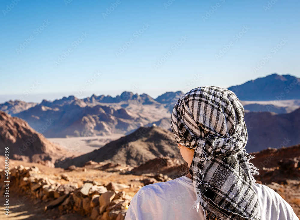 Muslim man in traditional Keffiyeh on top of Mount Moussa in South Sinai, Egypt