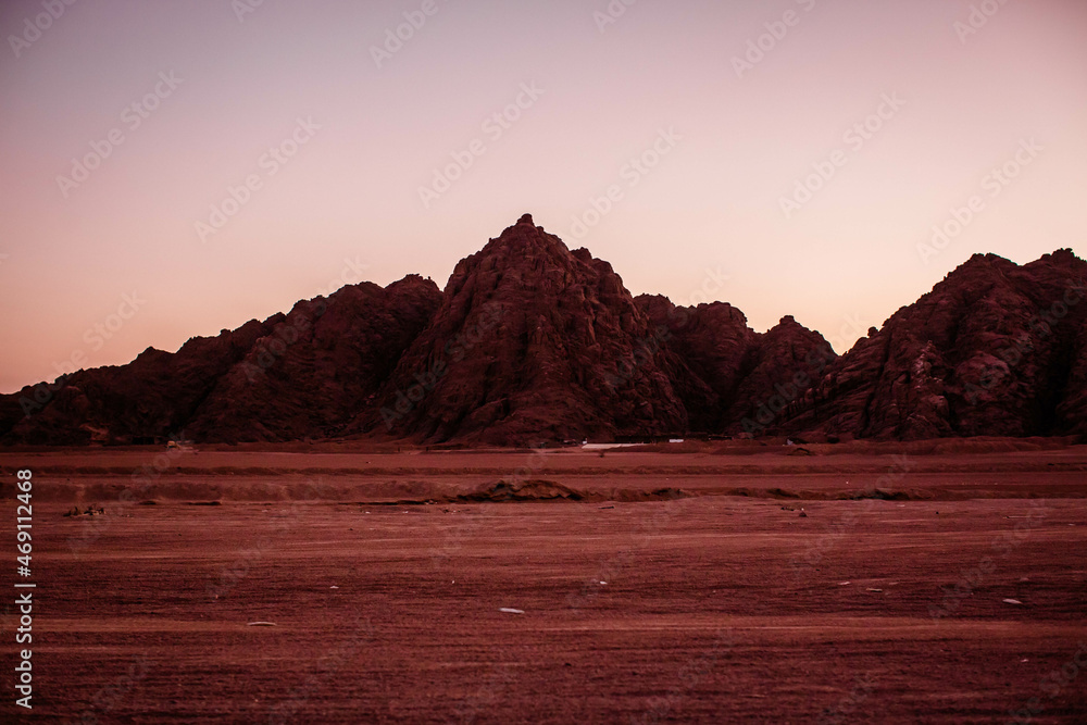 Egyptian desert near the Sinai Mountains at sunset.