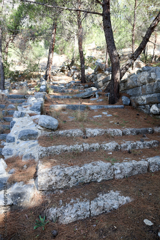 ancient dilapidated stone stairway in archaeological site Priene, Turkey