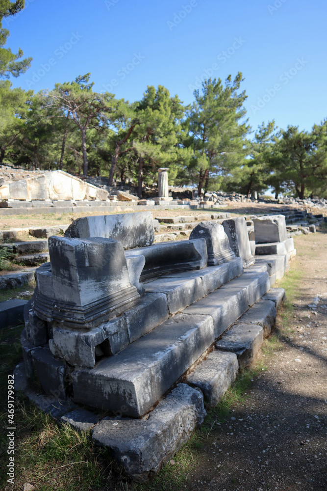view of agora in ancient town Priene in Turkey with fragments of marble columns