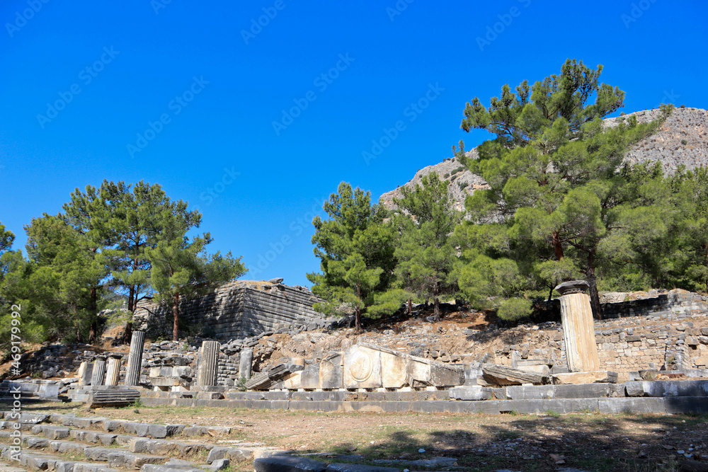 landscape with the ruins of agora in ancient city Priene with mountain Mycale on the background