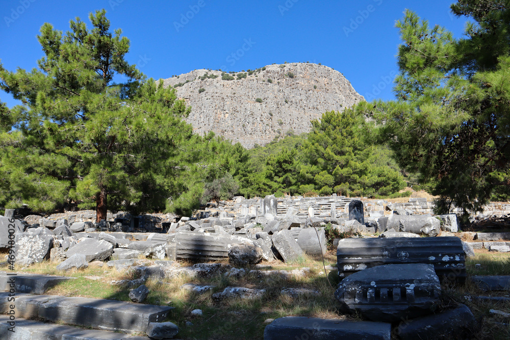landscape with the ruins of agora in ancient city Priene with mountain Mycale on the background