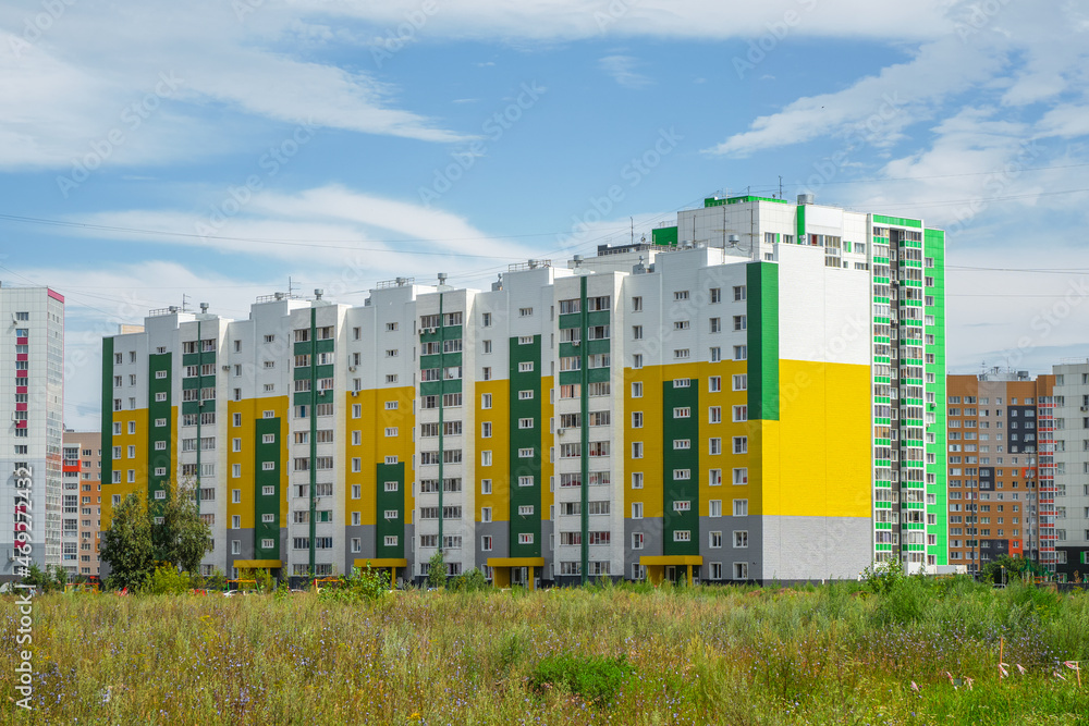Modern beautiful new buildings. Colored wall on the background of blue sky. Modern construction, new neighborhood. Copy space.