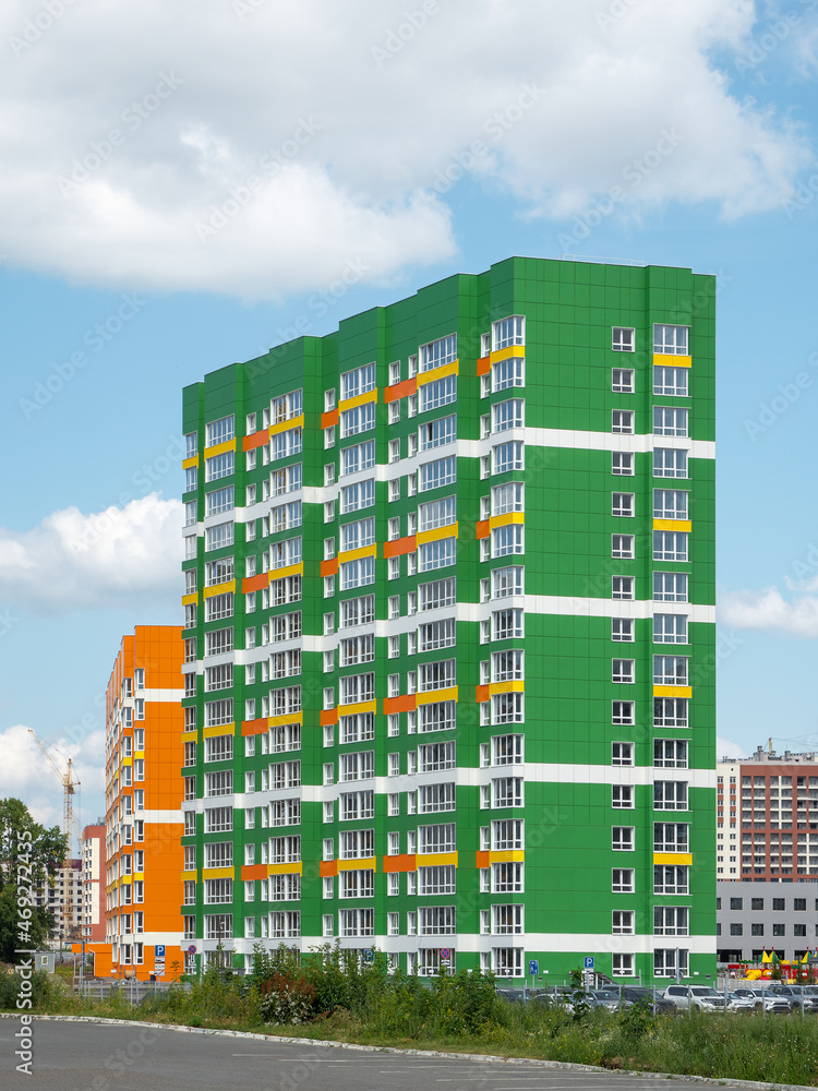 Modern beautiful new buildings. Colored wall on the background of blue sky. Modern construction, new neighborhood. Copy space.